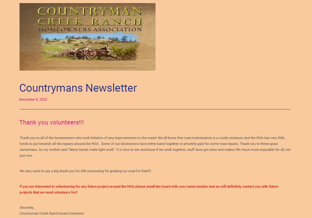 Welcome to the Countryman Creek Ranch Homeowners Association Official Website & Information Portal!